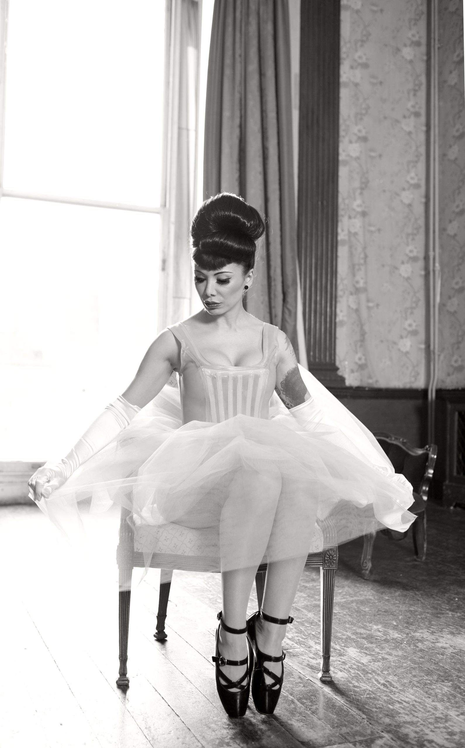 Latex Tutu with boned front panel and boned back seams. Back fastens with lacing. Tulle (net) skirt is very full and layered.