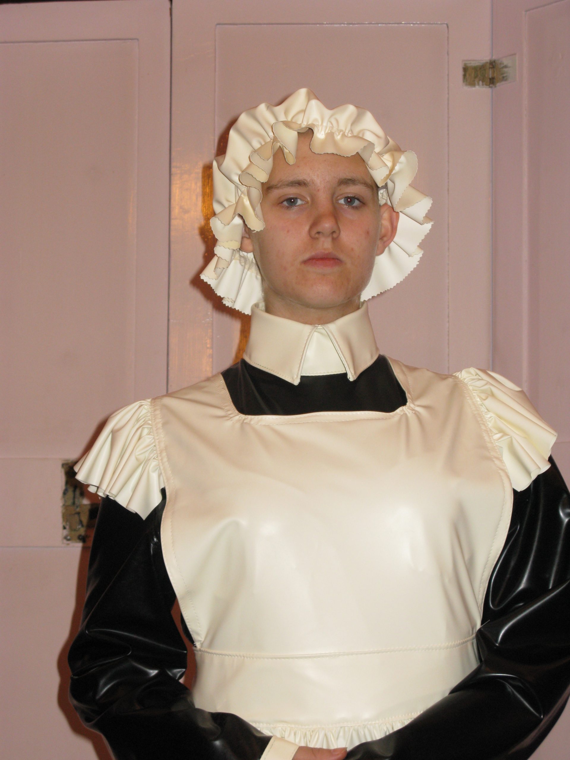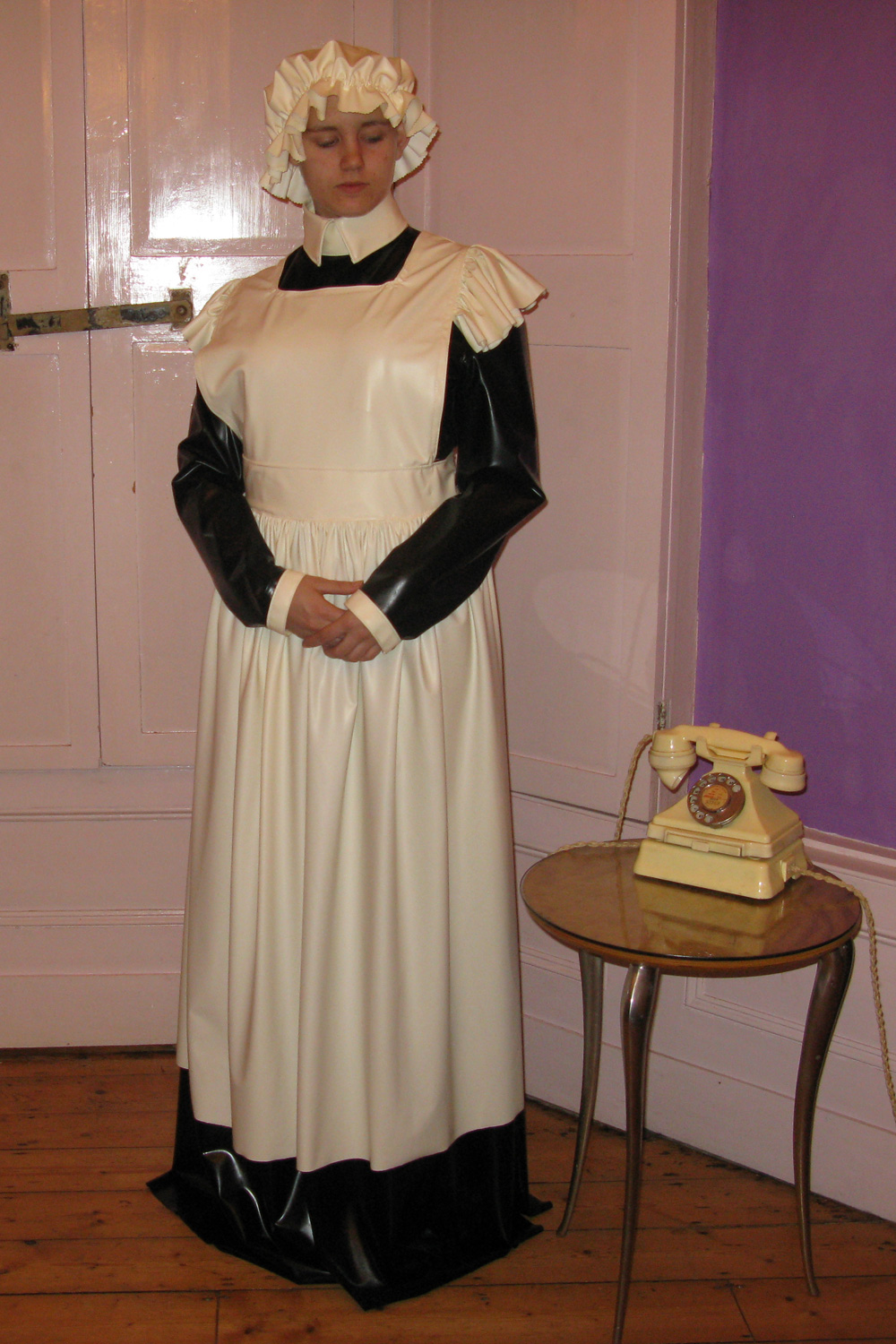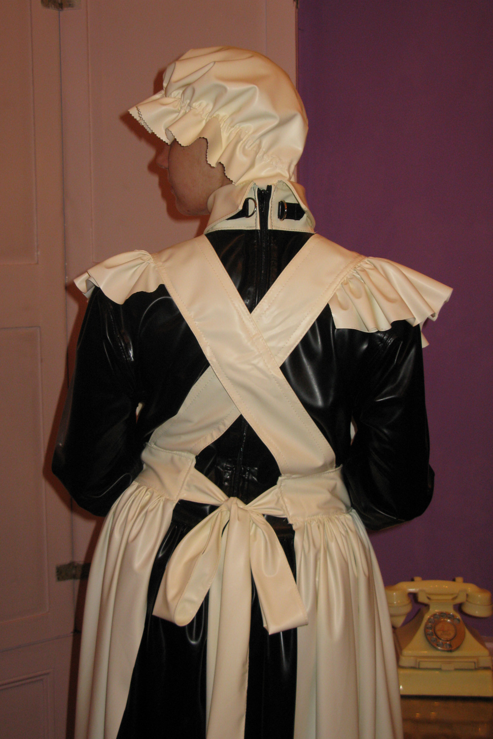 Traditional Victorian Maid’s Outfit with very full skirt attached to fitted bodice with high collared neck. A very elaborate apron featuring full skirt and frilled straps. Sold with matching mop cap.